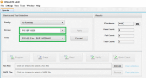 Подключить программатор к USB-порту ПК и открыть утилиту MPLAB X IPE. Программатор должен сам определиться и отобразиться в поле “Tool”.